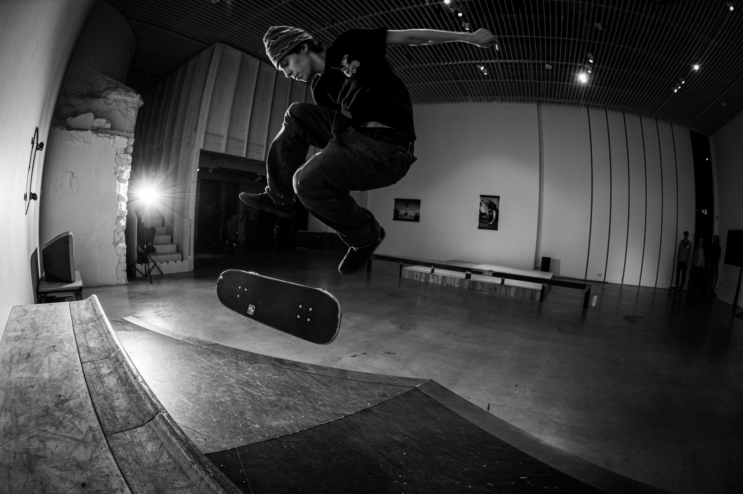 Sasha Loktev — mid-kickflip, frozen in motion.
