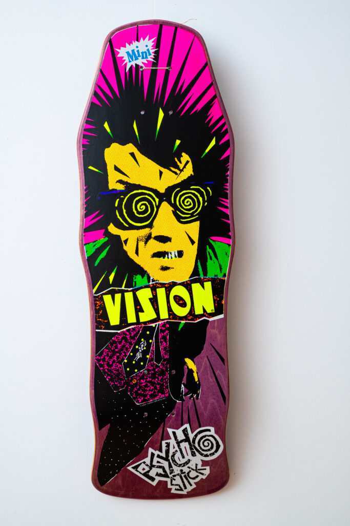 “The Vision Street Wear Psycho Stick deck—a psychedelic explosion of color and chaos straight out of 1986! With a graphic that give a nod to the Listen Like Thieves INXS album cover, this deck is an icon of its era.”