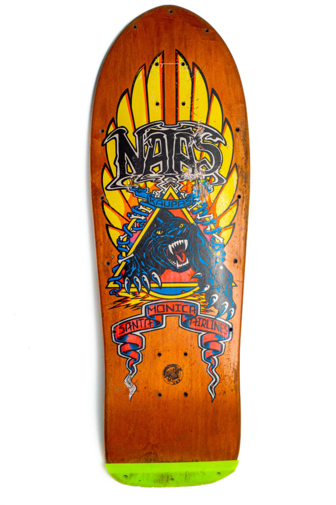 “The Santa Monica Airlines Natas Panther Deck was released in 1988 as Natas Kaupas’s pro model. The striking panther artwork was created by Jim Phillips, one of skateboarding’s most influential graphic artists. This deck is considered a landmark in skateboard history, representing the rise of street skating in the late 1980s”