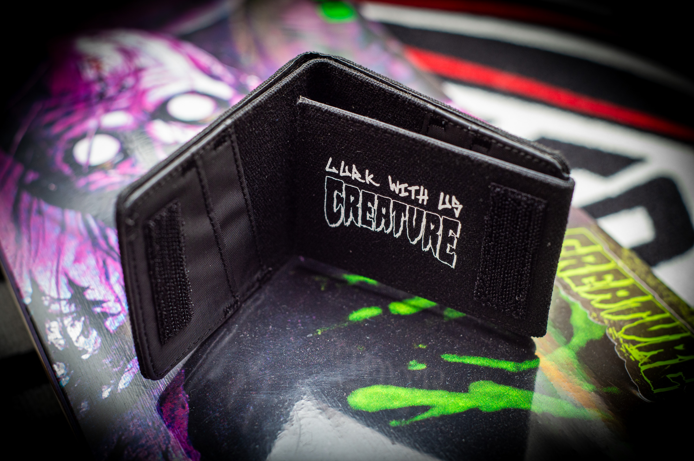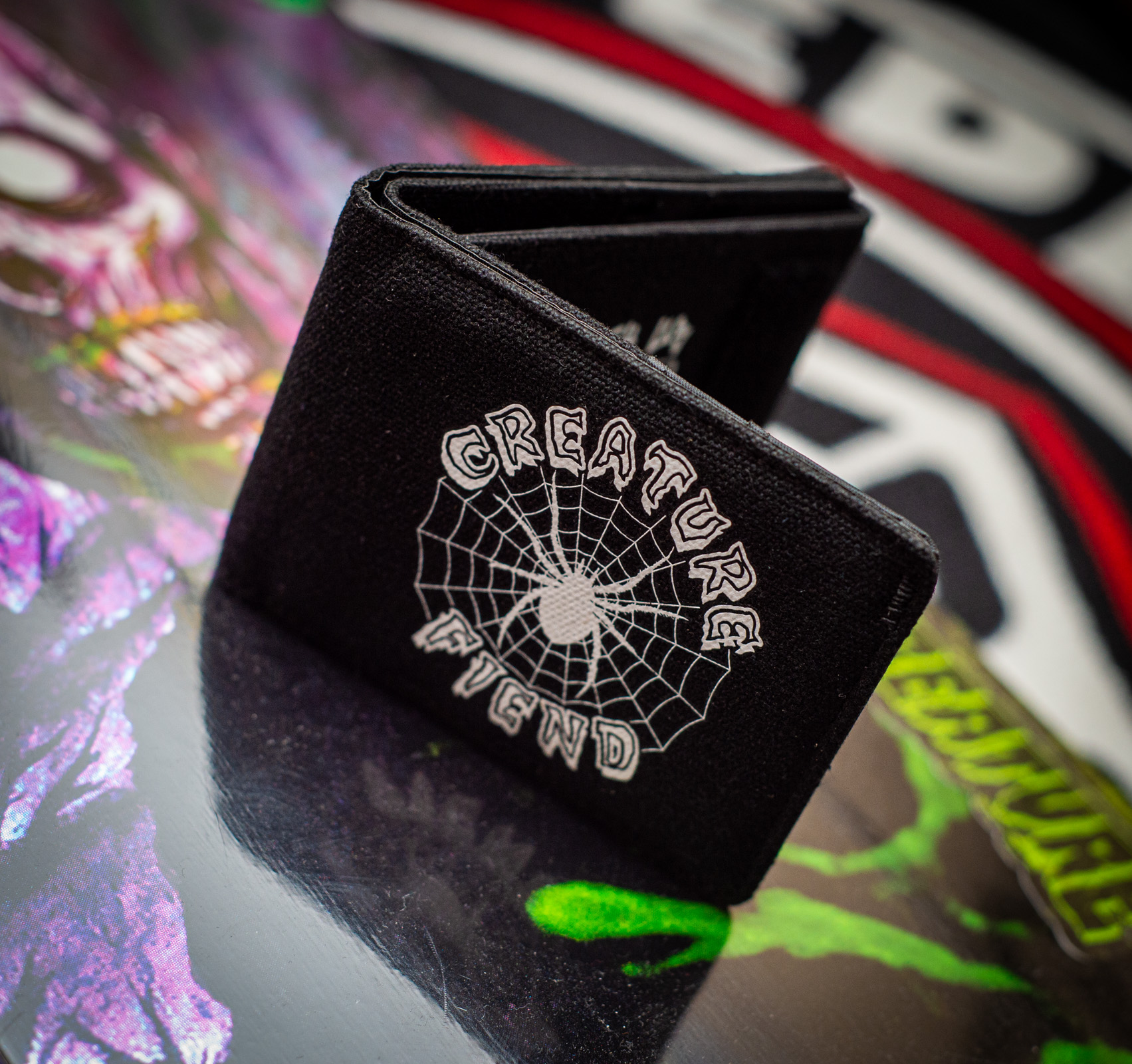 Creature Web Tri-Fold Wallet Features: Web Tri-Fold Wallet Printed Graphic Clear ID Holder Velcro Close Colour – Black