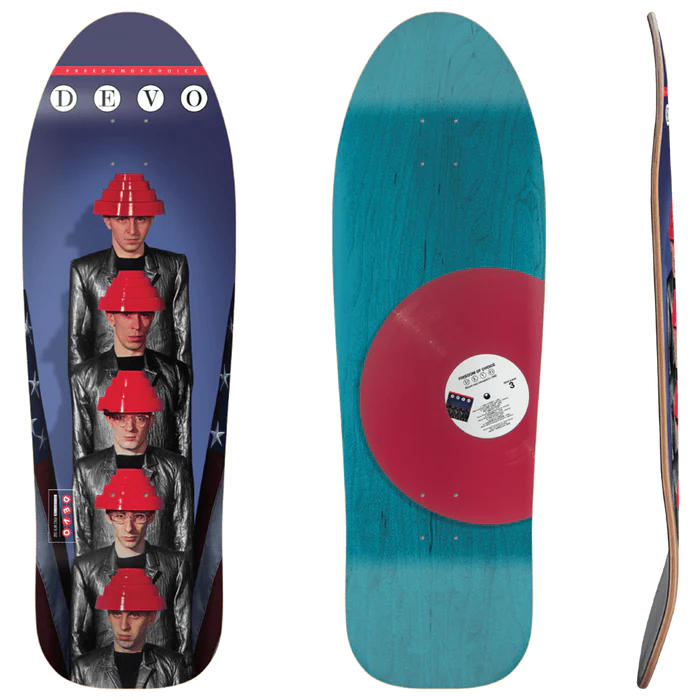 This “Freedom Of Choice” board is part of a 5 board series of DEVO’s 1st 5 Album Boards! in collaboration with ‘Perez With Saiz.’ This tribute board references DEVO’s 3rd album, “Freedom Of Choice,” Released in 1980. The top graphic features the record label of songs and credits.