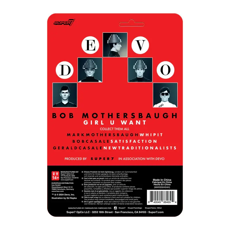 Are we not men? We are BOB 1! The new articulated, 3.75” scale DEVO ReAction Figure of Bob Mothersbaugh is inspired by his appearance in the 1980 music video for “Girl U Want” and features the lead guitarist in an iconic Energy Dome hat and metallic-silver naugahyde suit, and comes with a blue, cloud-shaped guitar with strap. Introduce your collection to “devolution” with this Bob Mothersbaugh ReAction Figure!