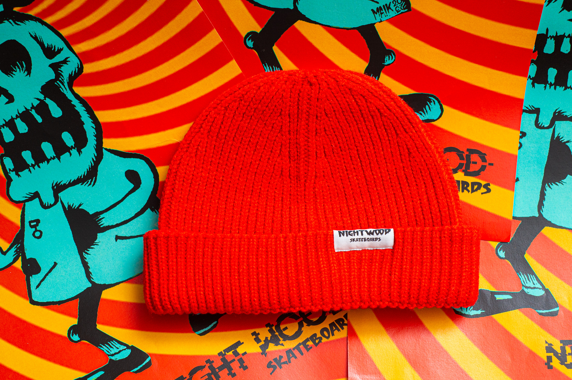 Nightwood Skateboards red, one size fit all. Made from at least 50% recycled polyester fabric.