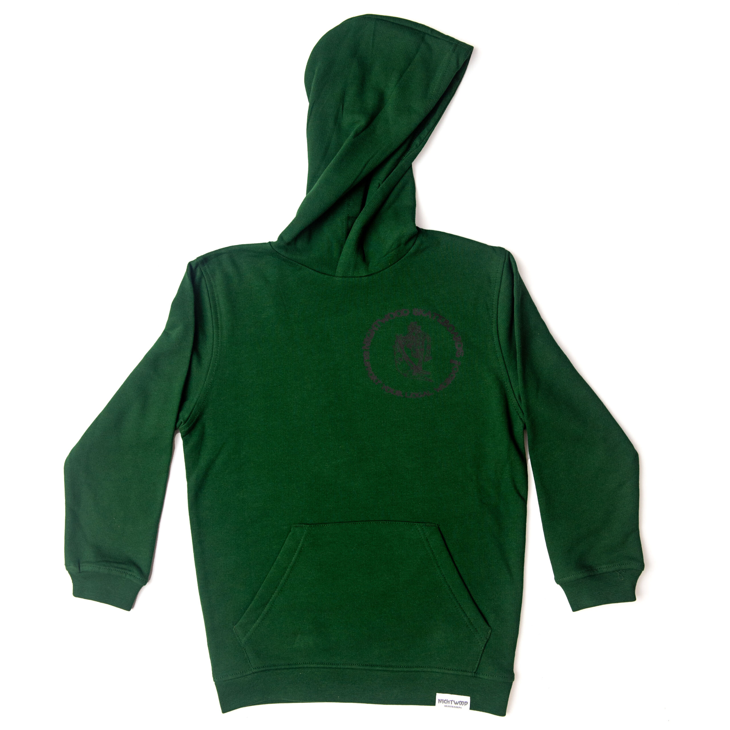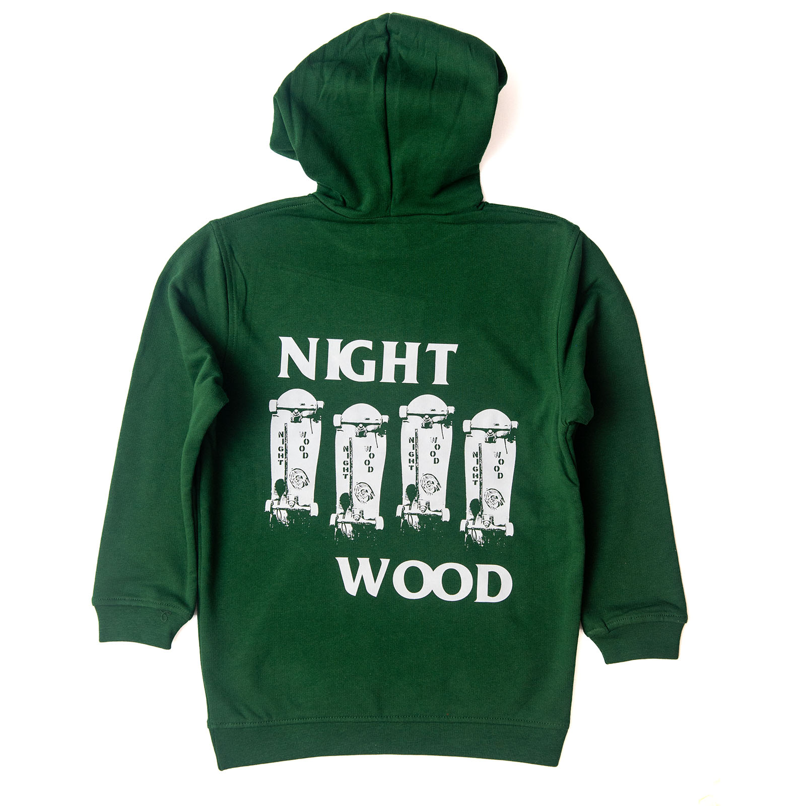Nightwood “Night-flag” Dark Green. Kid Size 9-11 years, 134-146cm Chest Original logo in front and “Night-flag” logo in back. 100% Cotton with Nightwood tag on the bottom left. Graphics by local Pool Fight Club !