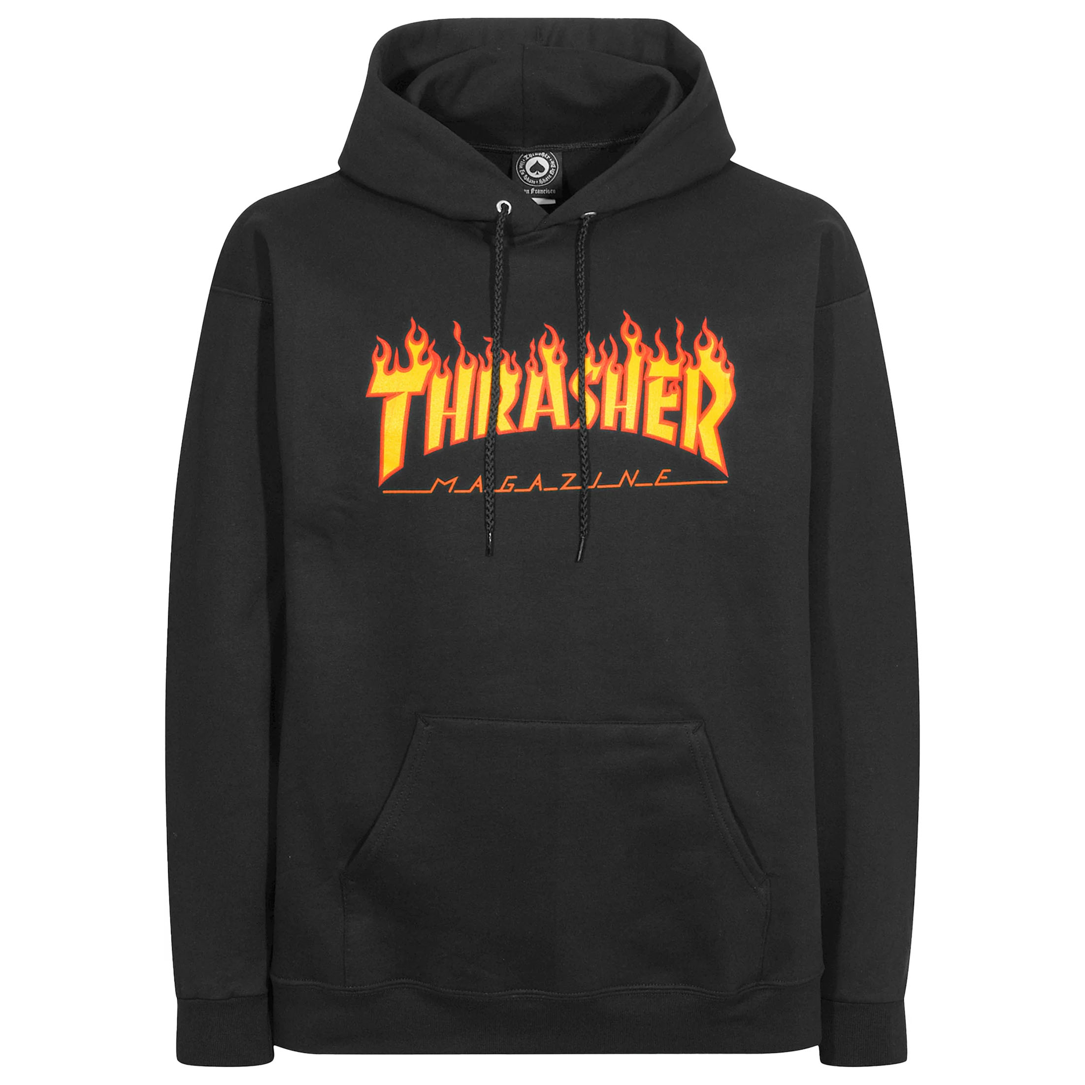 Thrasher Hoodie Flame Black size M Standard fit hoodie woven from cotton and polyester. Featuring an adjustable drawcord, kangaroo pocket, sewn-in label and finished with artwork at center-chest. 50% Cotton / 50% Polyester.